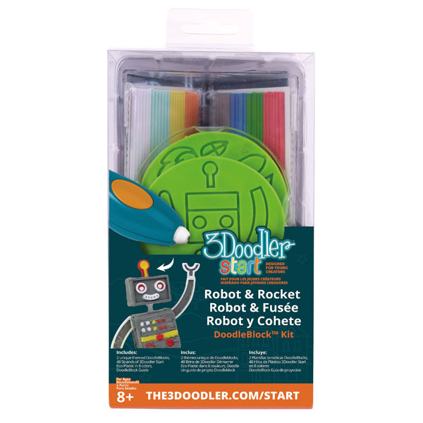 It doesn't matter if you are a complete beginner or an expert 3D doodler - these fun-to-use 3Doodler Block Kits will help you create your own multicoloured robots and rockets. These special multi-shape 3D templates make the process so easy - simply use your 3Doodler pen to doodle into the grooves and pop the finished piece out.