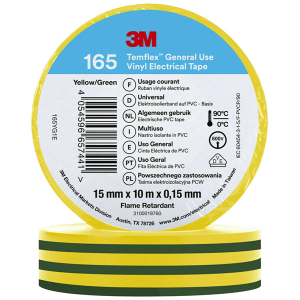 3M™ Temflex™ Vinyl insulating tape 165 is a 0.15 mm thick professional PVC insulating tape, suitable for indoor and outdoor use. Use 3M™ Temflex™ 165 vinyl insulating tape for primary insulation, repair and bundling of cables and cables (low voltage). This professional adhesive tape offers improved performance and is suitable for indoor and outdoor use.