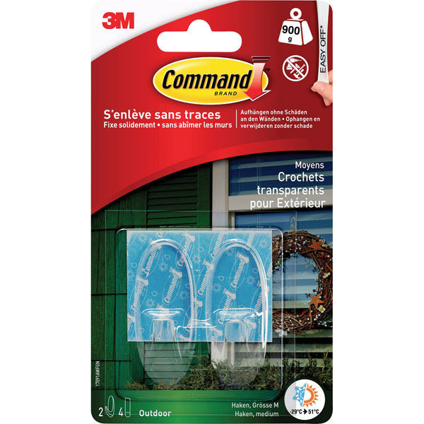 The transparent Command™ hooks are an innovative solution for safe and damage-free hanging of cranes, signs and other outdoor objects. They ensure a strong hold and can be removed without leaving any residue – damage-free thanks to 3M technology. UV‑ and water-resistant strips are suitable for temperatures between -29° C and +51° C, in wet and dry conditions.