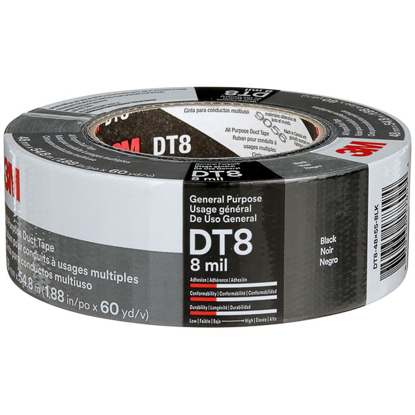 Constructed of polyethylene film laminated to cloth with a synthetic/ natural rubber adhesive blend , this aggressive tape resists curling and tears off the roll cleanly even when used in challenging jobs. The 3M™ All Purpose Duct Tape DT8 is designed to provide a versatile, conformable, and quick stick solution for demanding applications.