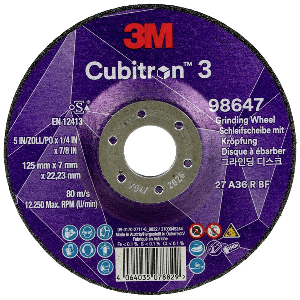 Cubitron 98647 grinding disc has a diameter of 125 mm and a bore diameter of 22.23 mm. Manufactured by Cubitron, it is known for its efficient grinding capabilities and durability. It is ideal for metalworking and surface preparation applications, and comes in a pack of 10.