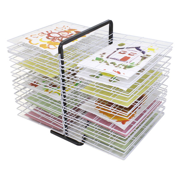 This double-sided, free-standing drying rack allows up to 40x A3 sheets to be easily loaded and unloaded. If extra thick drying space is required, shelves can be easily removed to create further space. The rack is finished in epoxy-coated resin for easy cleaning and is ideal for use in the classroom for drying children's paintings as each sheet can be allowed to dry without touching and sticking to others.