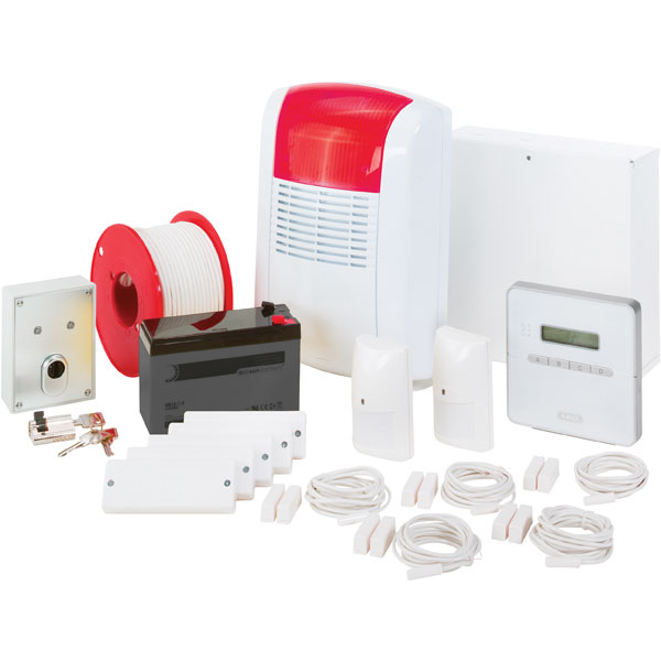 The kit includes a central unit, siren, 2x motion sensors, 5x opening detectors, 5x soldering distributors, 16-pin, half cylinder, key switches, installation cable and an emergency power rechargeable battery.