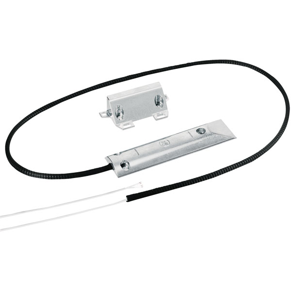 The door opening detector is mounted chiefly on roll-up, sliding, and up-and-over doors, while the detector consists of a magnetic contact (reed) and a magnet. These are fitted parallel to each other. The electric circuit of this NC opening detector is normally closed (NC). If the distance between reed and magnet increases, the circuit is broken and an alarm reported.