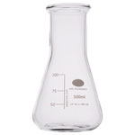 A range of wide mouthed conical Erlenmayer flasks made from borosilicate glass.