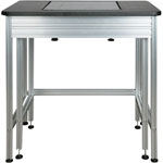 The table comprises two separate parts: An internal working surface consisting of a large granite slab mounted on adjustable rubber shock absorbing mounts, and an external service table with aluminium frame and adjustable levelling feet.