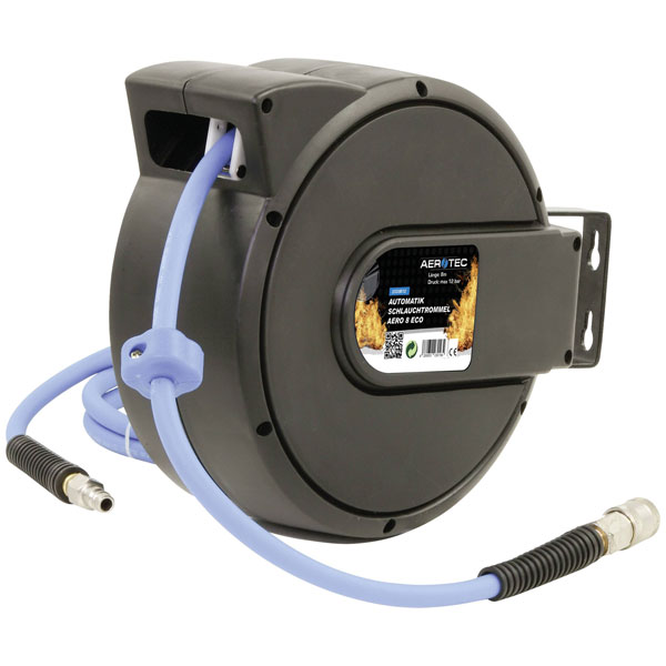 The Aerotec Air hose recoiler, model Aero 8 ECO, is a wall-mountable accessory designed for use with compressors, supporting up to 12 bar. This durable recoiler, identified by part number 2009612, efficiently organises air hoses and ensures a tidy workspace. Ideal for garage and workshop settings, it enhances operational convenience and efficiency.