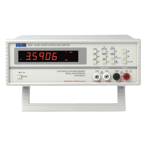 The Aim-TTi 1604 is a low-cost autoranging bench-top digital multimeter offering a large, bright LED display. With a multi-position tilt stand, the 1604's display can always be in an easy-to-read position - it stays where it is put even with heavy leads connected.
