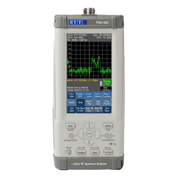 The Aim-TTi PSA1303 Handheld RF Spectrum Analyser is designed for field engineers who need a compact, rugged, and highly capable instrument. Covering a frequency range from 1MHz to 1300MHz, it offers a typical noise floor of –115 dBm and resolution bandwidths from 300Hz to 10MHz, enabling precise measurement of weak and complex signals. Its 4.3 inch colour TFT display with a hierarchical menu system provides quick access to all major functions, assisted by hard keys for marker control and frequently used operations. This portable analyser delivers rapid start up, with the first sweep available in under two seconds.