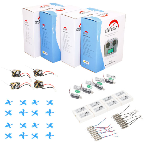Each of the 4 micro drone component kits is supplied with a FS-i6S transmitter, 2 batteries and a USB battery charger, allowing for immediate flying once assembled.
