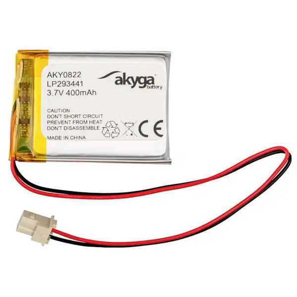 Akyga AKY0822 is the Manufacturer's Part Number for a rechargeable lithium polymer (LiPo) battery pack with a voltage of 3.7 volts and a capacity of 400 milliampere-hours. This particular model, also referred to by its alternate description as the Akyga LP293441, is a non-standard rechargeable battery designed for versatile applications where compact and lightweight power sources are required. Key features include high energy density and the ability to maintain a stable discharge rate, making it suitable for use in portable electronic devices, such as handheld instruments, wireless communication equipment, and compact sensor units. The battery's thin profile allows for integration into designs where space is at a premium, while its rechargeable nature offers a cost-effective and environmentally friendly power solution for engineers seeking a reliable power source in various technical applications.
