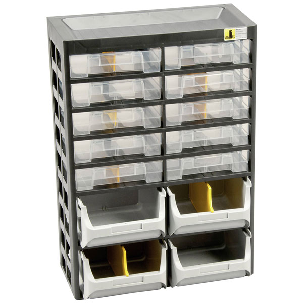 The Allit storage bin, model 458140, is a versatile storage container measuring 305 x 435 x 170 mm and designed for efficient organisation. Available in black, grey, and yellow, this VarioPlus Basic D 21 model is suitable for storing and transporting various items. It is ideal for use in workshops, garages, and home storage solutions.