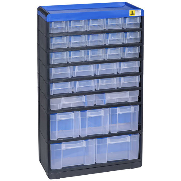 The Allit VarioPlus Pro 53/60 is a small parts container designed for efficient storage and transport, with dimensions of 300 x 525 x 135 mm. It features a robust construction available in black and blue, perfect for organising various small components. This storage box is ideal for workshops, garages, and any setting requiring systematic organisation of small items.