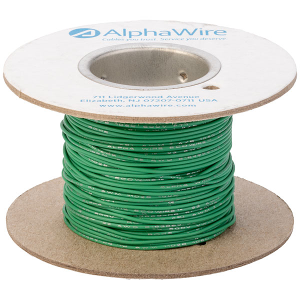 A green 22AWG hook-up wire that is part of the EcoWire family of fully recyclable wire. The wire features increased performance due to its unique modified polyphenylene ether (mPPE) thermoplastic insulation which is non-halogenated and contains heavy metal pigments, allowing it to help meet WEE requirements. Additional features such as better dielectric strength, wide temperature range that meets VW-1 and low specific gravity make this wire suitable for a wide range of applications.