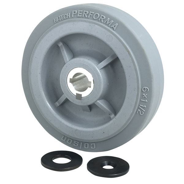 The non-marking thermoplastic elastomer tread is permanently bonded to a ribbed polyolefin wheel core which is fitted with a 19.05mm (¾in.) aluminium hub with a 6.35mm (¼in.) key-way. Each wheel comes with two steel discs for holding the wheel in place on the end of a 19.05mm (¾in.) shaft.