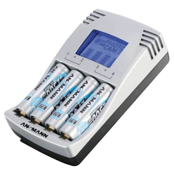 This Ansmann PhotoCam IV battery charger is a plug-in charger for 2 or 4 AAA or AA rechargeable Nickel Hydride batteries. It features automatic battery-full-detection (-deltaV) and an LCD display.