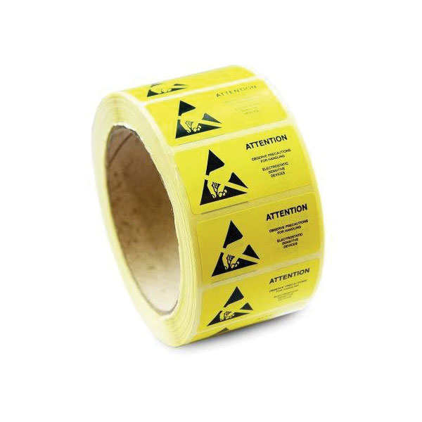 Antistat produces a range of self-adhesive yellow ESD labels suitable for electronic components, available in various sizes and quantities.