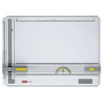 A professional quality A3 drawing board that incorporates a compass plotting scale that enables the quick picking out of radii. The board provides a smooth work surface that can be cleaned and allows comfortable and efficient drawing. The board is lightweight and portable and provides a smooth, sturdy background to enable precise lines. The drawing board clamps paper in at least two different angles, allowing hands to be free at all times. The solid guide track ensures smooth straightedge movement.