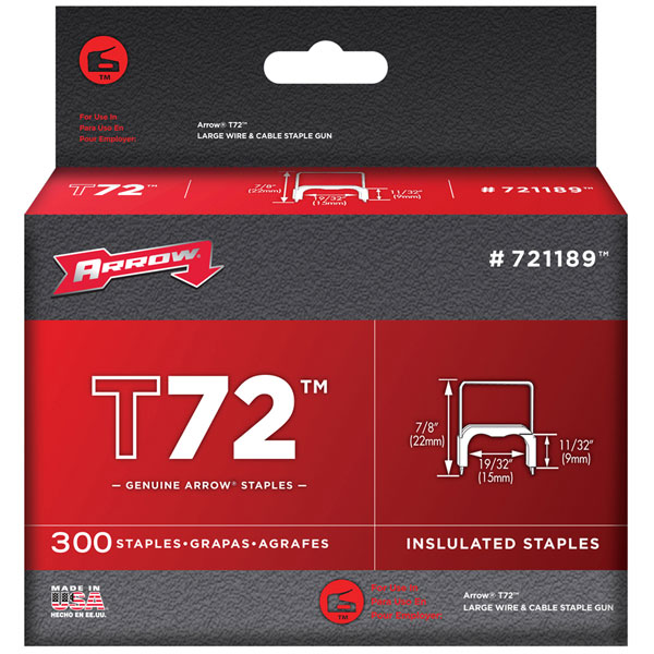 For use with the Arrow T72 staple gun. The exclusive design of the gun, along with the insulated staples, allows the safe and secure installation of all types of wiring up to 15mm / 9/16in.