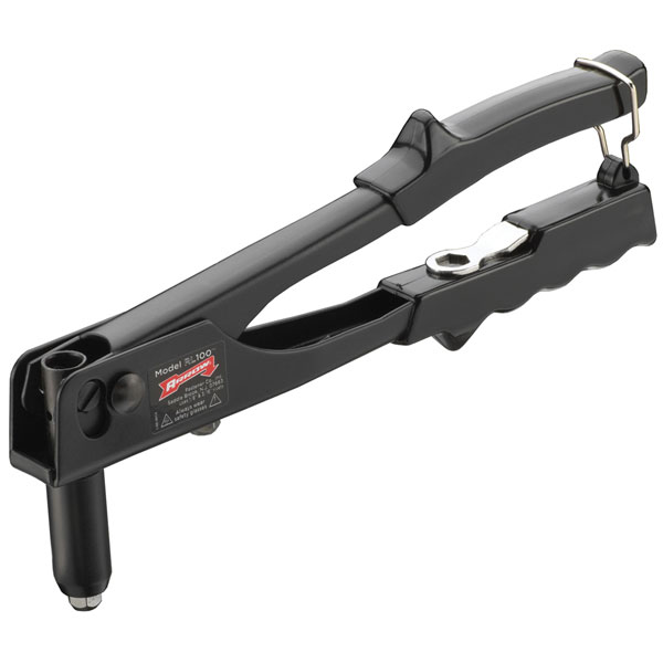 The Arrow RL100 riveter is made of an all steel construction with comfortable vinyl grip. The spring-loaded handle allows for easy rivet loading and ejection, with the changeable nosepiece taking a 1/8 diameter rivet in one hole, and 5/32 and 3/16 diameter in the other hole.