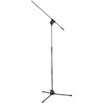 A sturdy microphone stand with an aluminium base and swivel arm and steel main tube.