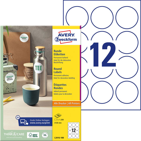 Avery-Zweckform L3416-100 is a product consisting of all-purpose labels with a diameter of 60 mm, composed of white paper and featuring a permanent adhesive suitable for inkjet printers. Each package contains 1200 labels, making them ideal for high-volume labelling tasks. This product's reliable adhesive quality ensures long-lasting performance, making it suitable for various engineering applications where durable labelling is required. These labels are typically used for organising inventory, labelling laboratory samples, and categorising components in manufacturing environments. Their compatibility with inkjet printers allows for customisation and clear, precise printing of information critical in technical settings.