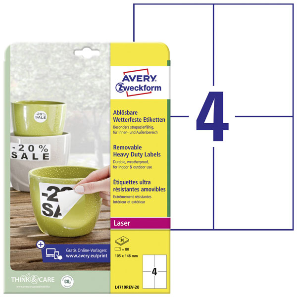 Avery-Zweckform L4719REV-20, linked to the GTIN 04004182049808, is a high-quality label film designed for precision labelling needs. Measuring 105x148mm, this removable polyester label sheet comes in a pack of 80, providing a durable yet flexible solution for various identification and organisational tasks. Being made of polyester, the labels exhibit excellent tear resistance and are suitable for indoor and limited outdoor applications, where robustness and the ability to reposition or remove the labels without leaving residue are required. Ideal for use in laboratory settings, manufacturing environments, and office scenarios, they support engineers' needs for temporary but reliable labelling on equipment, shelves, and containers. As a product categorised under Paper, Pads & Labels, it offers ease of use with most standard printers and ensures clear, legible print results.