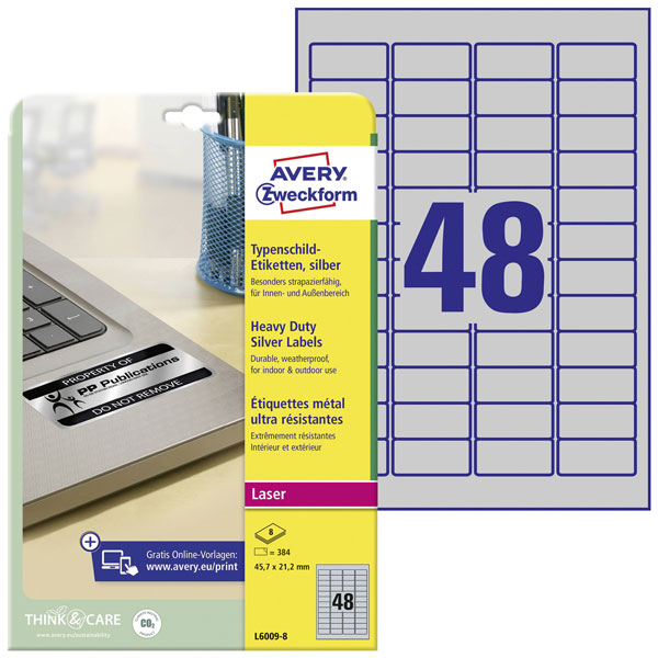 Avery-Zweckform L6009-8 is a durable and versatile labelling solution designed for precise applications where clear identification is essential. These nameplates are constructed from silver polyester, offering a robust and resilient surface that is resistant to wear and tear. The dimensions of each nameplate are 45.7 by 21.2 millimetres, providing an ample space for text or barcodes, and are appropriate for environments requiring high durability and clarity, such as asset management, inventory labelling, and equipment identification. As part of Avery-Zweckform's extensive range of paper, pads, and labels, this product is available in packages containing a total of 384 pieces, making it suitable for large-scale labelling demands. With its reputable engineering precision, the L6009-8 model addresses critical needs in both industrial and commercial settings, ensuring reliable and lasting identification solutions.