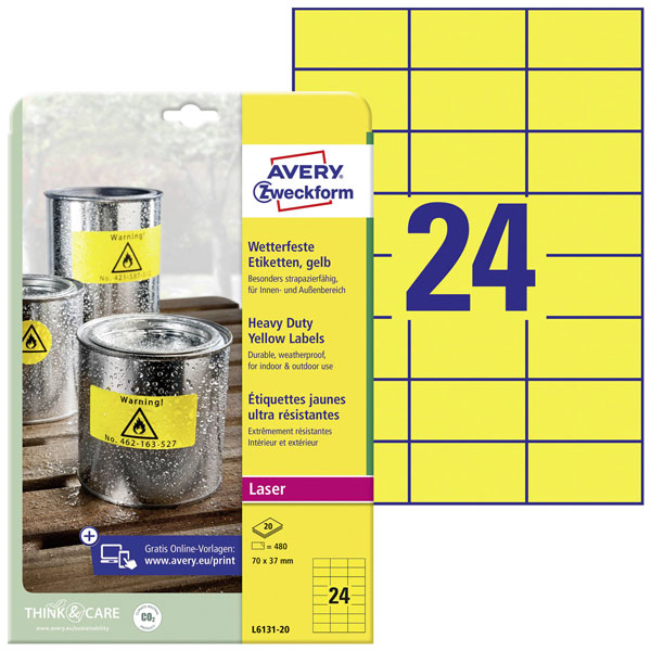 Avery-Zweckform L6131-20 Label Yellow Polyester Film 70x37mm 480 Pack Permanent