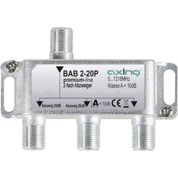 Axing 1611670, BAB 2-20P, is a high-performance coaxial connector designed specifically as a cable TV splitter that integrates seamlessly with audio and video setups. The device facilitates a two-way signal distribution within the frequency range of 5 to 1218 MHz, making it suitable for a wide array of television and communication installations requiring precise signal management. Engineered for use in residential and commercial environments, this splitter ensures minimal signal degradation and optimal performance across its operating bandwidth. Its robust construction supports consistent functioning over prolonged periods, addressing the demands of modern digital and analogue broadcast systems. The Axing BAB 2-20P can be employed in various applications including cable television distribution, home theatre systems, and broadband Internet services, offering reliable connectivity solutions for engineers and technical professionals.