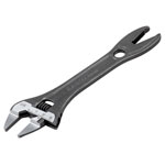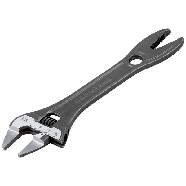 The Bahco 31-T Thin Jaw Adjustable Spanner has one open-end with serrated shark jaws for pipe fittings, loosening rounded nuts and bolts, working with round objects etc. It is equally strong in both directions. At the other end, there is an extra-wide jaw opening with a laser scale in mm for pre-adjusting and accurate measurement.
