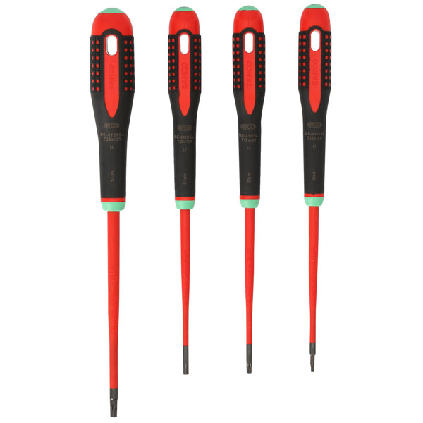 Bahco ERGO™ Slim VDE Insulated Screwdrivers are suitable for work on live equipment, up to 1,000 Volts, high quality blade insulation moulded directly onto the blade. The high-performance alloy steel blade has been chrome plated and entirely hardened for high protection against corrosion, long life tool. A black oxide tip provides higher accuracy.