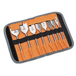 An 8-piece flat wood drill bit set in a practical wallet-type pack. The wallet has been made for easy access and safe storage of the drills.