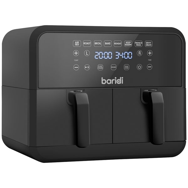Each basket holds 1.1kg of fries! Includes touch controlled air fryer, 2x 4L non-stick oven baskets, 2x crisper plates with 360-degree airflow technology.