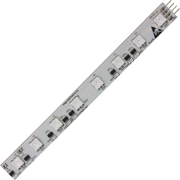 An LED strip with 27 ultrabright SMD RGB LEDs. The module consists of a high-quality backing with a reflective white coating that ensures a significantly higher light yield. The LEDs are also protected by an addiitional protective diode. Socket connectors at the start and end of the board allows you to produce custom lengths. The board can be split at the indicated positions, every 135 mm (9 LEDs). The length is limited by the maximum current of 1.5 A.