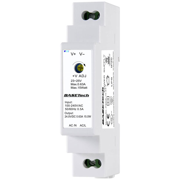 The Basetech PSDS-15-24-2 rail mounted PSU is a 24 V, 0.63 A, 15 W power supply unit designed for industrial applications. It features a single output and is ideal for use in environments requiring reliable din rail power supplies. Typical applications include powering control cabinets and other industrial systems.