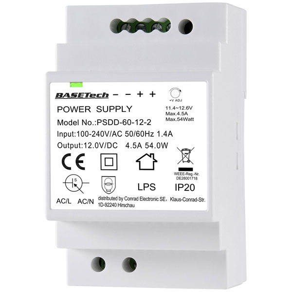 Basetech BT-2250320 PSDD-60-12-2 DIN Rail PSU 12V 4.5A 54W 2 Outputs