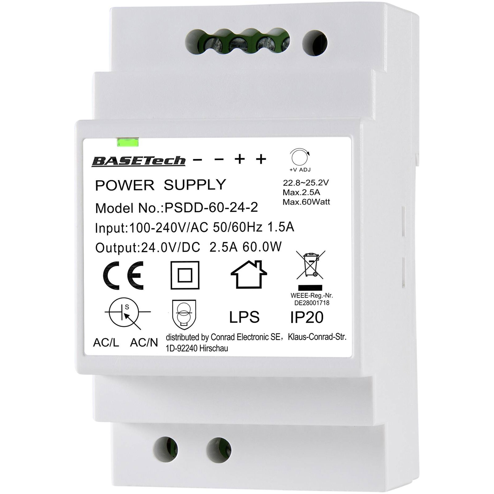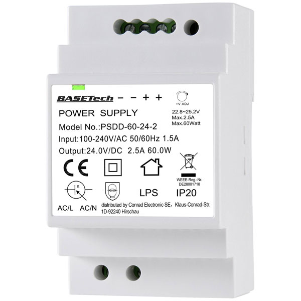 Basetech BT-2250321 DIN Rail PSU 24V 2.5A 60W Short Circuit Protection