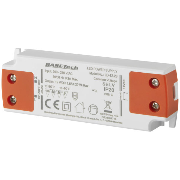 Basetech's LD-12-20 LED transformer provides a constant voltage of 20 W and 1.66 A, suitable for use on furniture and flammable surfaces. It is designed to protect against overvoltage, ensuring reliable performance for LED applications. This transformer is ideal for powering LED strips and other low-voltage LED systems.