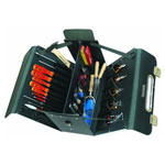 Supplied with the following tools: Side cutters, 145mm; telephone pliers, 160mm; water pump pliers, 240mm; combination pliers, 165mm; wire strippers, 155mm; 2 slotted screwdrivers with square handle, 125 x 5.5mm and 150 x 8mm; screwdriver for grub screws, 80 x 2.8mm; voltage tester; 3 safety insulated slotted screwdrivers, 100 x 4mm, 125 x 5.5mm and 150 x 6.5mm; 2 safety insulated Phillips screwdrivers, sizes 1 and 2; 2 steel tweezers, fine bent tips and straight flat-wide; 2 workshop files, flat and blunt and half-round; cable stripping scissors; cable knife; wire-stripping knife; 8-piece Allen key set in plastic case; engineer's hammer; firmer chisel; flat chisel; electrician's chisel; 2 twist gimlets, 3mm and 6mm; punch with plastic handle; trowel with wooden handle; plasterer's trowel; rubber beaker; folding rule; spirit level; pocket hacksaw.
