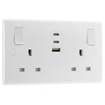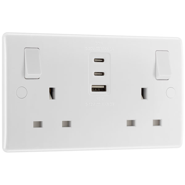 This Nexus 800 series white moulded 13A double socket from British General comes with 1 type A USB charging port and 2 x type C USB ports allowing you to plug in an electrical device and charge mobile devices simultaneously without having to sacrifice a power socket. Its moulded white front-plate has a high resistance to fading, discolouration and scratches, with inherent anti-microbial properties proven to reduce bacterial development and inhibit the growth of infectious diseases. With its rounded edge finish, the white moulded wall plate will seamlessly fit with any style or décor in your home, and fits a 25mm backbox, ideal for retro-fit.
