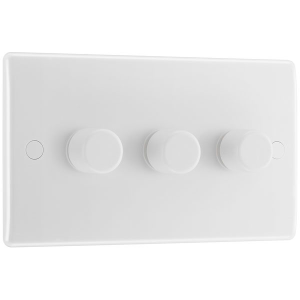 This Nexus 800 Series triple dimmer switch from British General is suitable for dimmable LED, halogen and incandescent lighting, setting the mood and saving power in domestic and commercial environments. The intelligent circuit monitors the load; soft-start reaches required levels within 1 second for longer lamp life and no buzzing. Overload protection turns lights down/off to prevent failure. 2 way switching allows a second switch to be added to the circuit. Trailing edge technology supports lower wattage lamps and eliminates flicker. It has a high resistance to fading discolouration and scratches, with inherent anti-microbial properties proven to reduce bacterial development and inhibit the growth of infectious diseases. BG Nexus 800 Series offers stylish, slim-profile white moulded wall accessories with round edges and colour matching screw caps. Minimum mounting box 25mm. Includes 30-year manufacturer's guarantee, providing peace of mind.