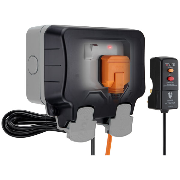 This outdoor weatherproof double socket from BG is the perfect solution for a temporary outdoor power source. The IP66 rated enclosure provides a high level of protection against ingress from water and dust I the most arduous of conditions whilst the polycarbonate housing offers high impact resistance. Designed with fast fix screws for quick installation, and large open/closer paddles for easier operation, with a patented cable entry to prevent accidental opening. Supplied with 3 metres of cable and an RCD plug that adds an additional level of safety by cutting off power in the event of a fault.