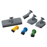 Set includes: 3 soft brushes for bathroom and kitchen; 1 large wire brush for ovens and sinks; 1 large soft brush for surface cleaning; 1 window squeegee and grout cleaner.