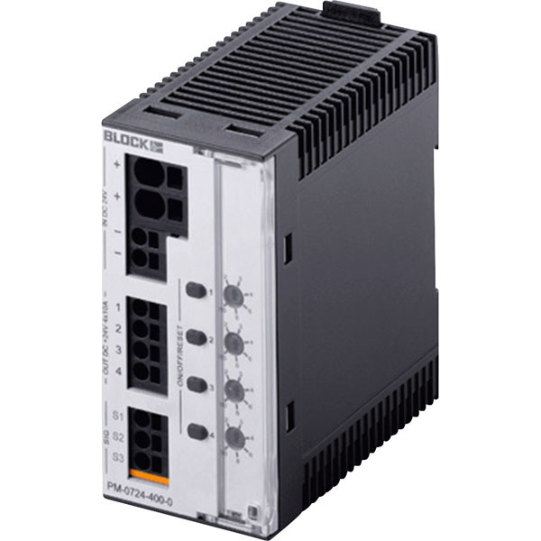 The Block PM 0724-200-1 is a DIN Rail Circuit Breaker that distributes and monitors the load current over several current circuits. Overloads and short circuits on an output are reliably recognised.