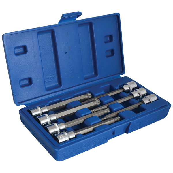 The BlueSpot 7 Piece 3/8in Drive Extra Long Spline Socket Bit Set is manufactured from chrome vanadium steel for increased durability. Features an extra long (110mm) shaft for accessing hard to reach areas that conventional bits cannot reach.