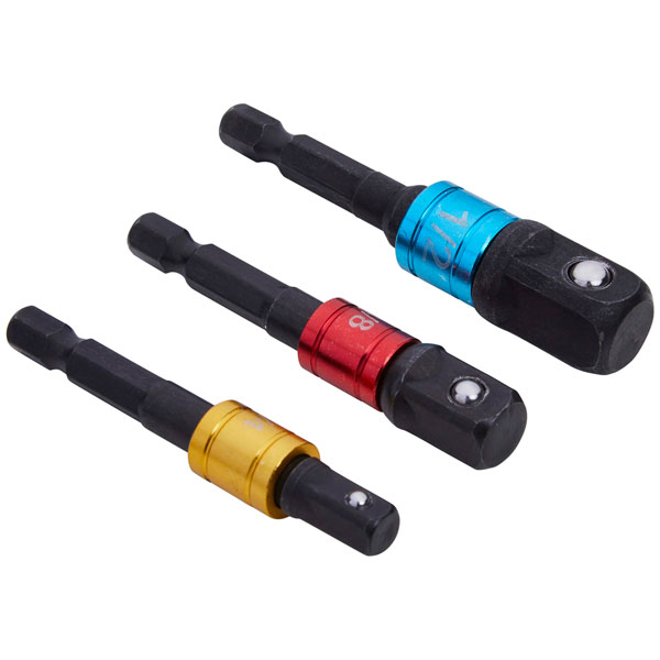 These BlueSpot Colour-Coded Impact Socket Adaptors are manufactured from chrome vanadium steel for increased durability. The colour-coded collars enable quick selection of the adaptor required. A ball bearing helps secure the socket when in use.
