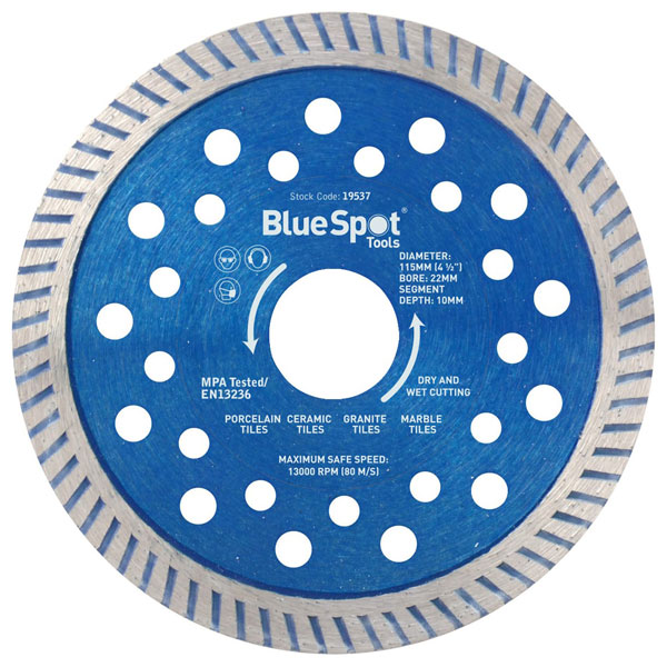 The BlueSpot Tools Turbo Cutting Disc is specially designed to provide fast and accurate dry and wet cutting. Ideal for cutting through general masonry, concrete, engineering bricks porcelain, ceramics, granite, and marble. High resistance to breakage and long-lasting durability. The turbo design of the blade offers long cutting life and stable cutting performance due to its ability to cool the disc more efficiently.