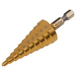 The BlueSpot Tools HSS 1/4in Hex Shank Step Drill is ideal for precision drilling in aluminium, brass, copper, plastic, steel and wood. Drills holes in 2mm increments from 4 - 22mm. Manufactured from high speed steel for increased durability and cutting power. Titanium coated to reduce friction and heat. 2mm step increments. The hex shank enables the step drill to be quickly fitted to any 1/4in power bit adaptor.