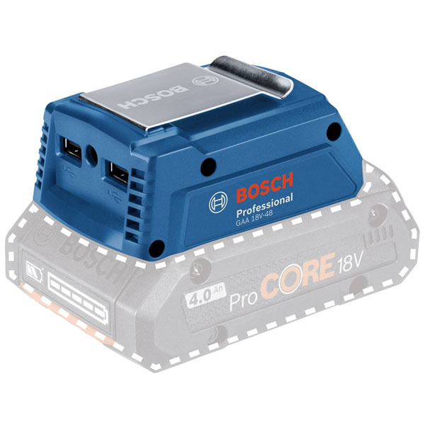The Bosch Professional GAA 18V-48 USB charging station, model 06188000L6, is an efficient power solution for charging devices. It features dual USB ports, enabling simultaneous charging of two devices. Ideal for on-site work, it ensures your tools and gadgets are always ready for use.